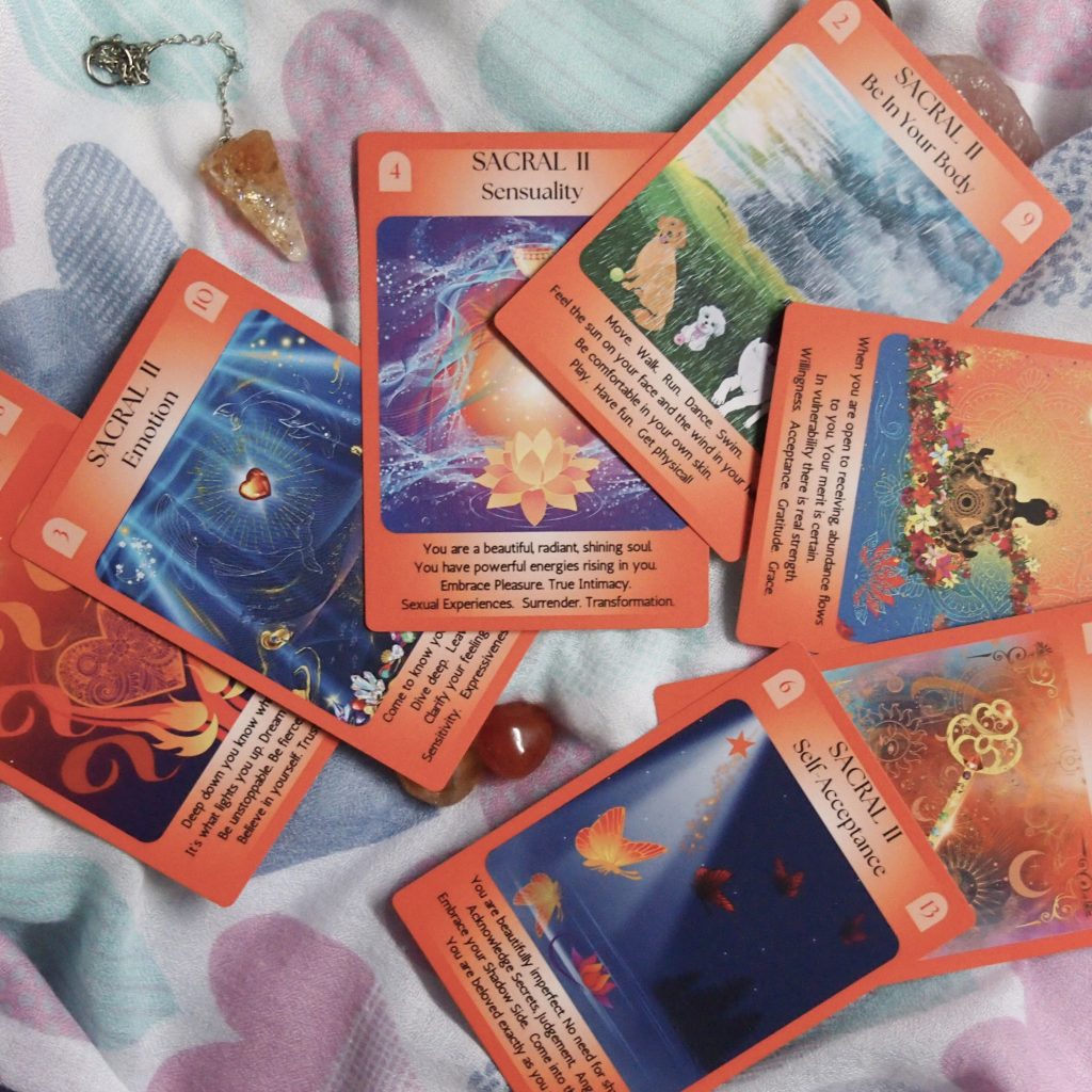 • Check out what it says in the guidebook about the Chakra, and then about the specific card drawn.