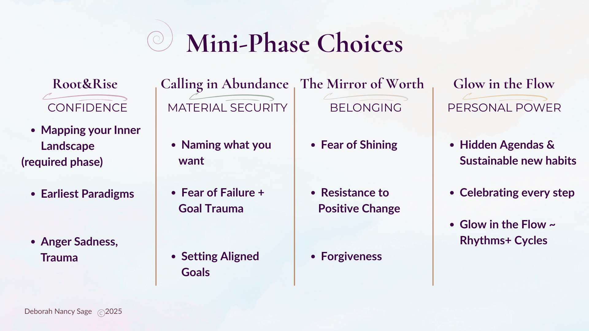 Every journey begins with Mapping Your Present — a grounding session where we explore the emotional patterns that shape your confidence, abundance, belonging, and personal power.
